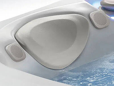 Die Befestigungen der Lautsprecherrostoberfläche sind in die Wanne eingelassen, und Konturkissen sorgen für eine angenehme Nackenstütze.